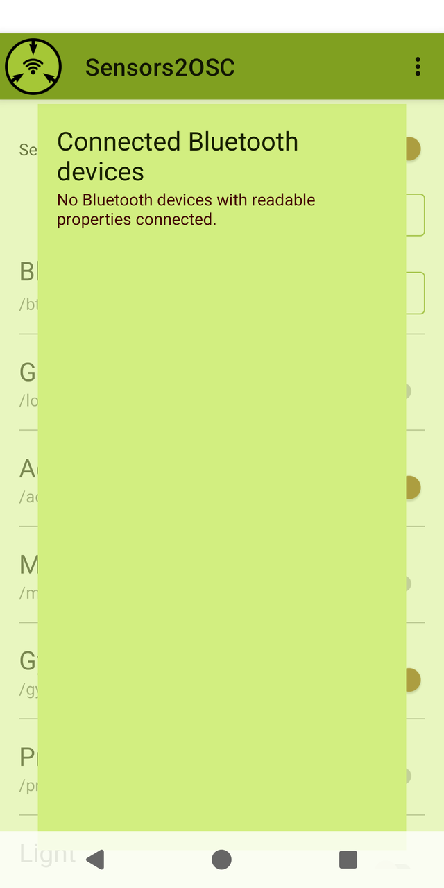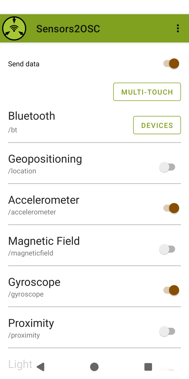 Depending on your Android version and your device, a number of sensors are available for apps to read. This app enables you to selectively send this data as float over OSC to any receiver.