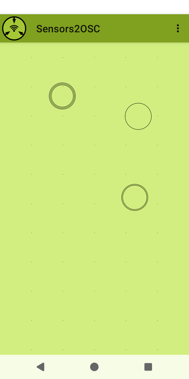Tapping on multitouch while sending data is enabled opens an area for sending touch data. Each finger touching the phone will send a three dimensional data corresponding to the number of the finger, plus Cartesian coordinates, normalized to a range of 0 to 1, starting from bottom left. Lifting the finger will result in a message of -1 on both axes. Indexing starts at 0. The receiver address is /touch