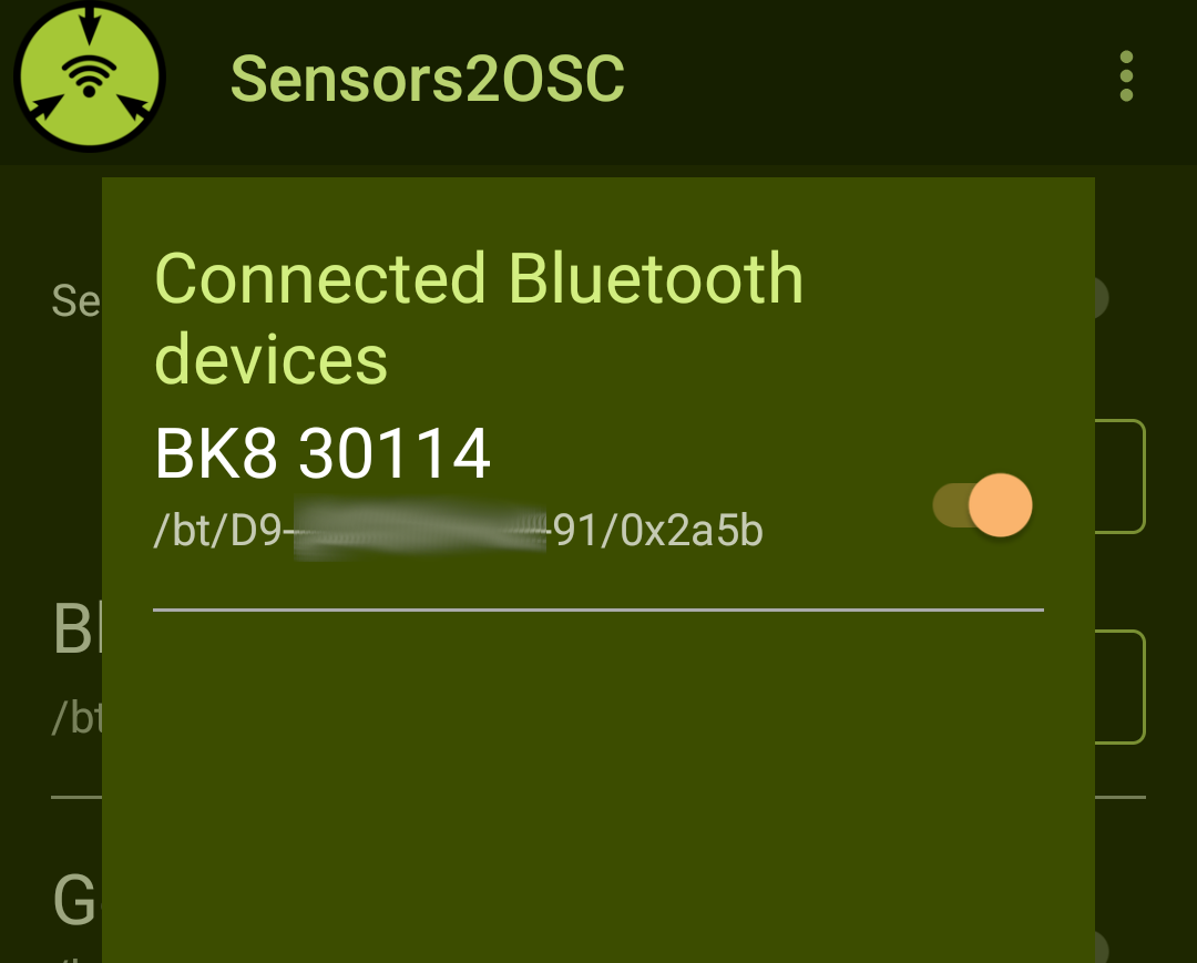 Bluetooth data is sent as a byte array. Available sensors can implement multiple profiles, and if sending is selected, the raw byte array of the sensor readings is sent as an OSC blob with the format /bt/[MAC address of sensor]/[profile id] ,b [byte array].